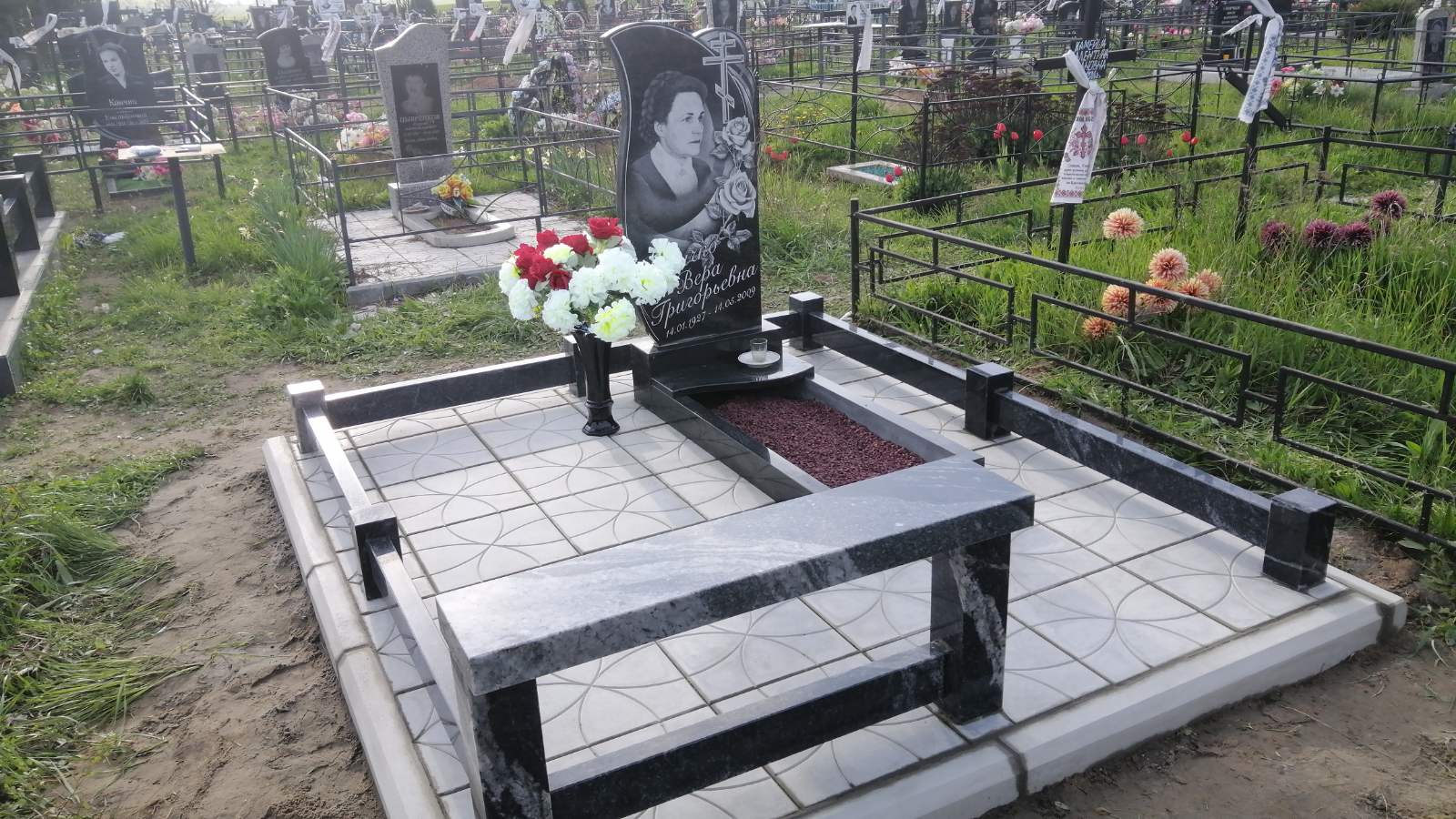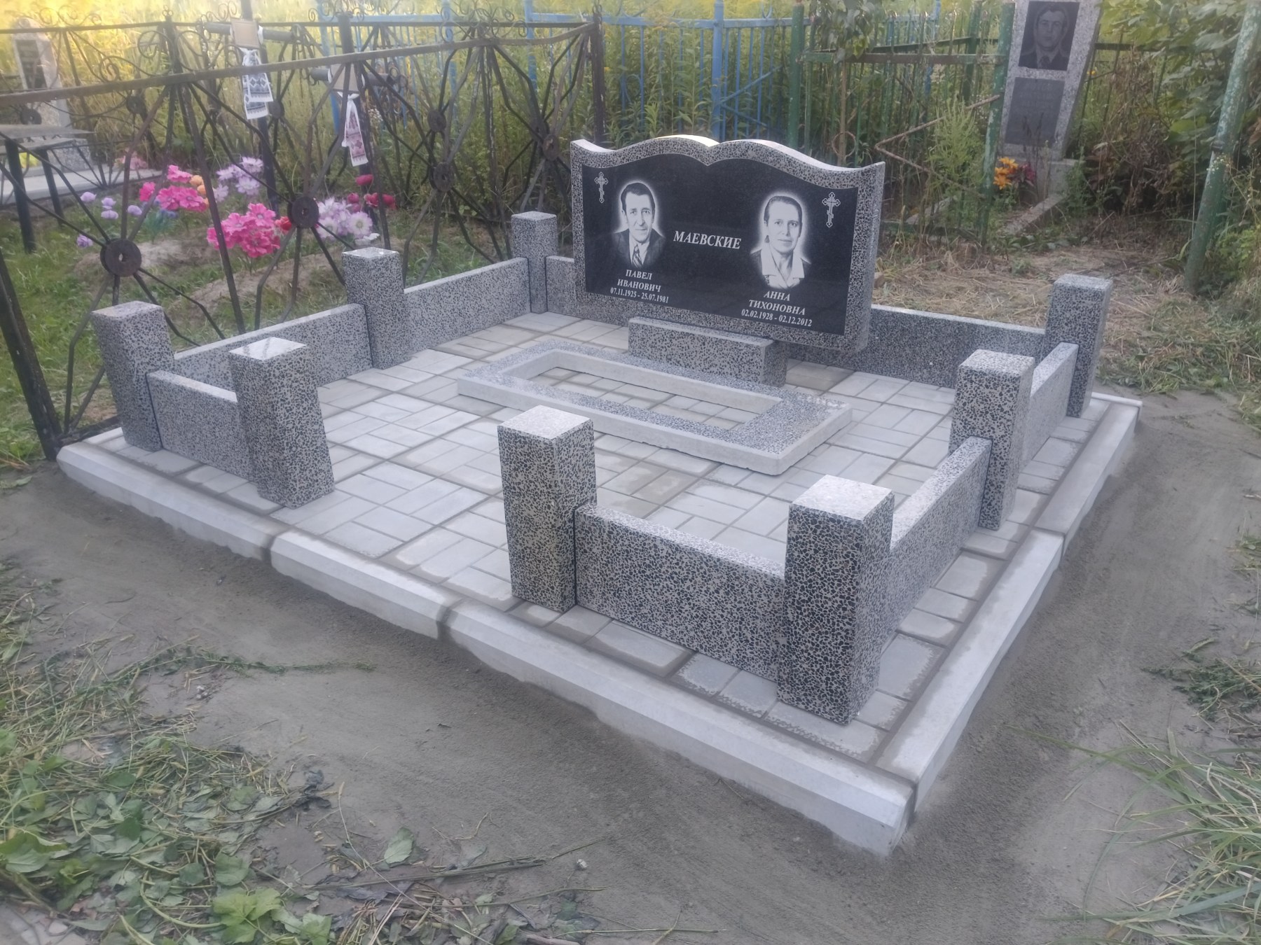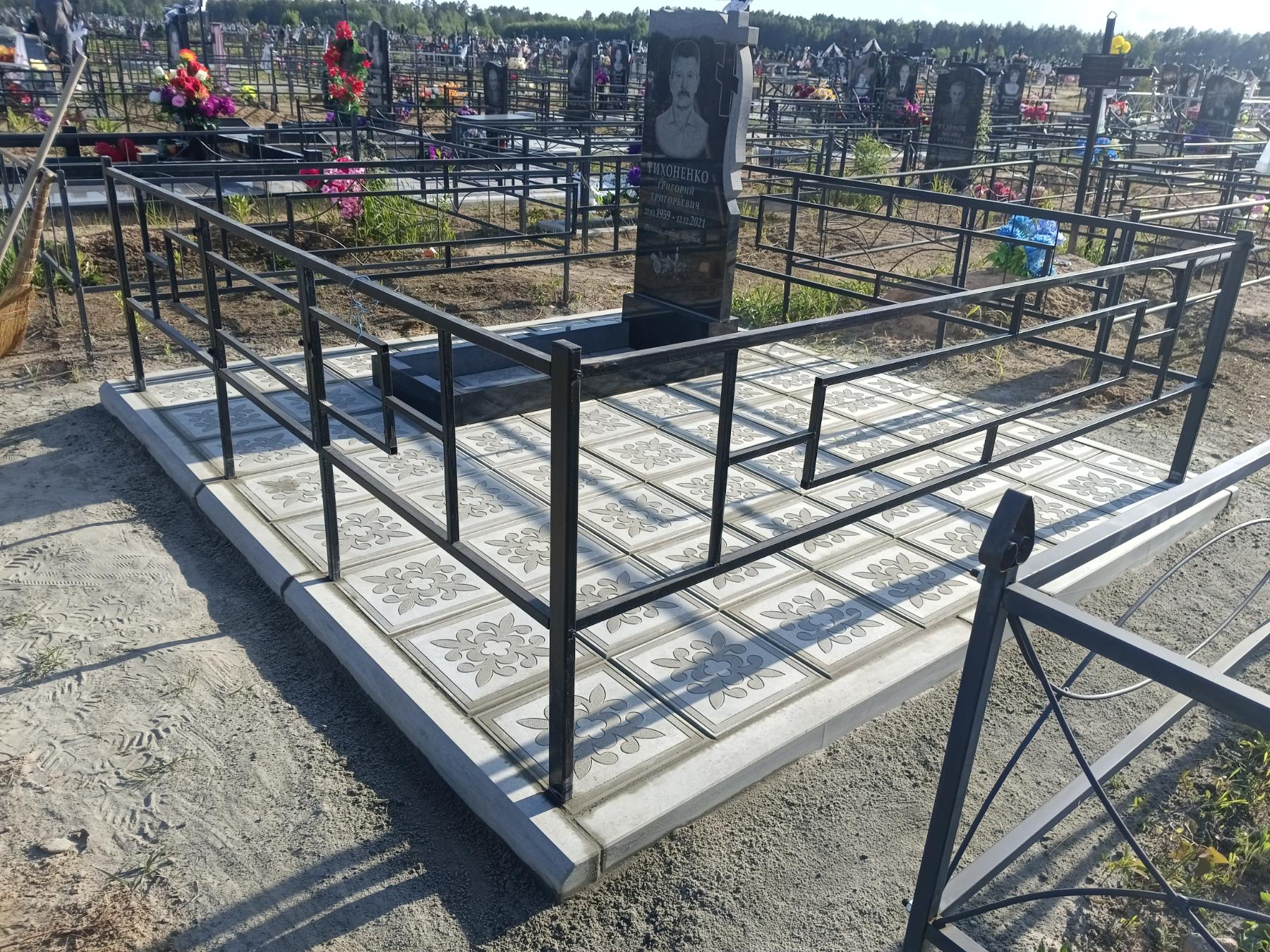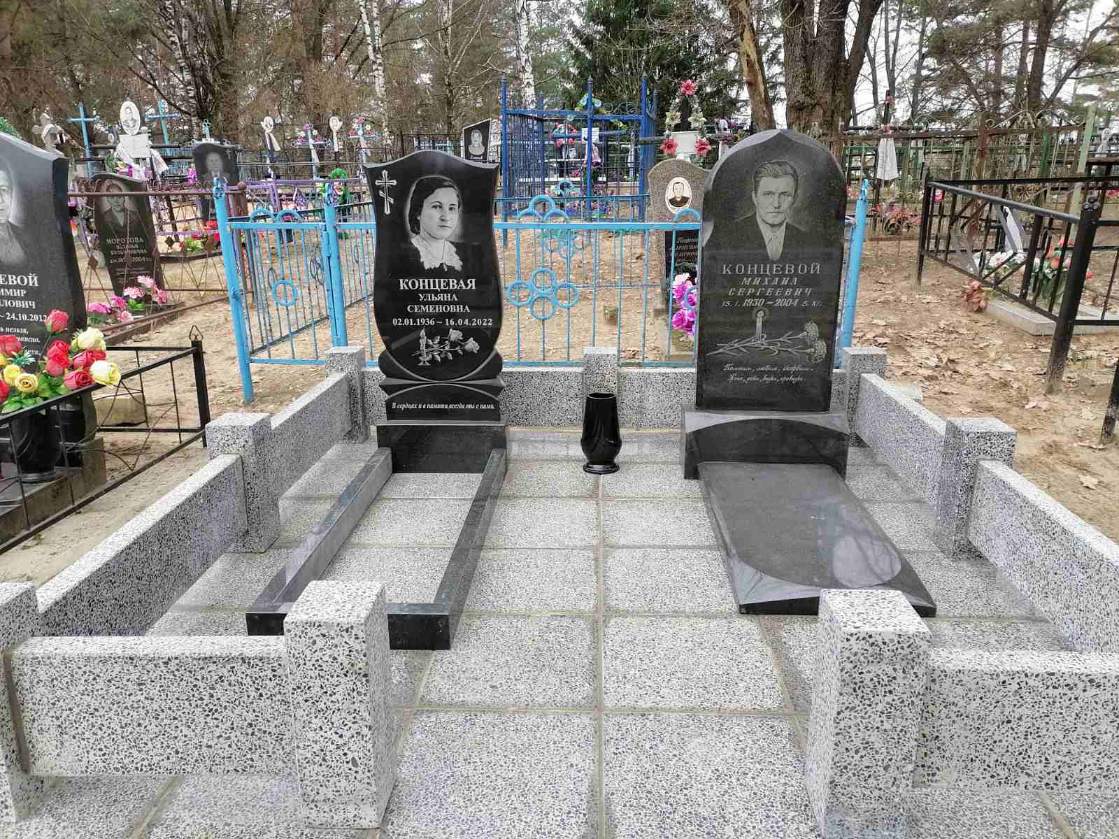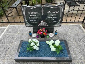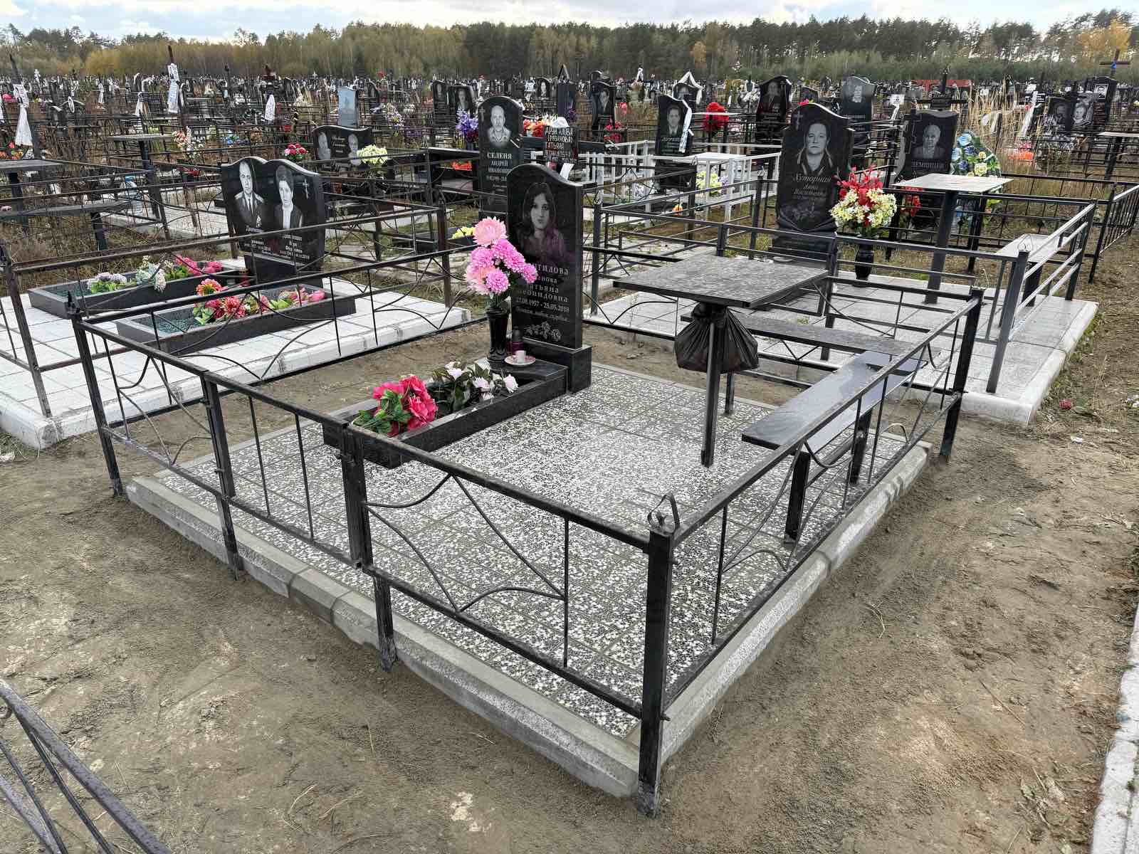 Что может входить в комплекс? Например, одна или несколько стел с ручной или пескоструйной гравировкой, разные модели цветника, бетонный цоколь с облицовочной плиткой, столик и скамья, вазы с цветами.