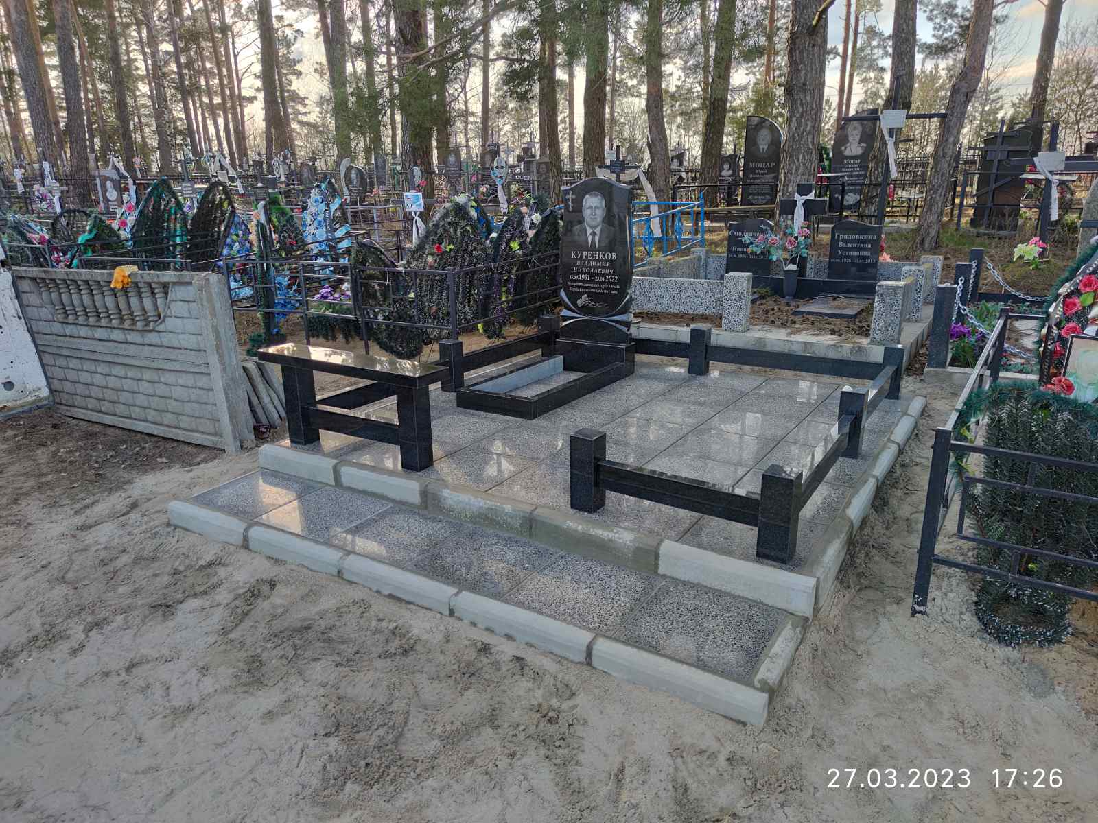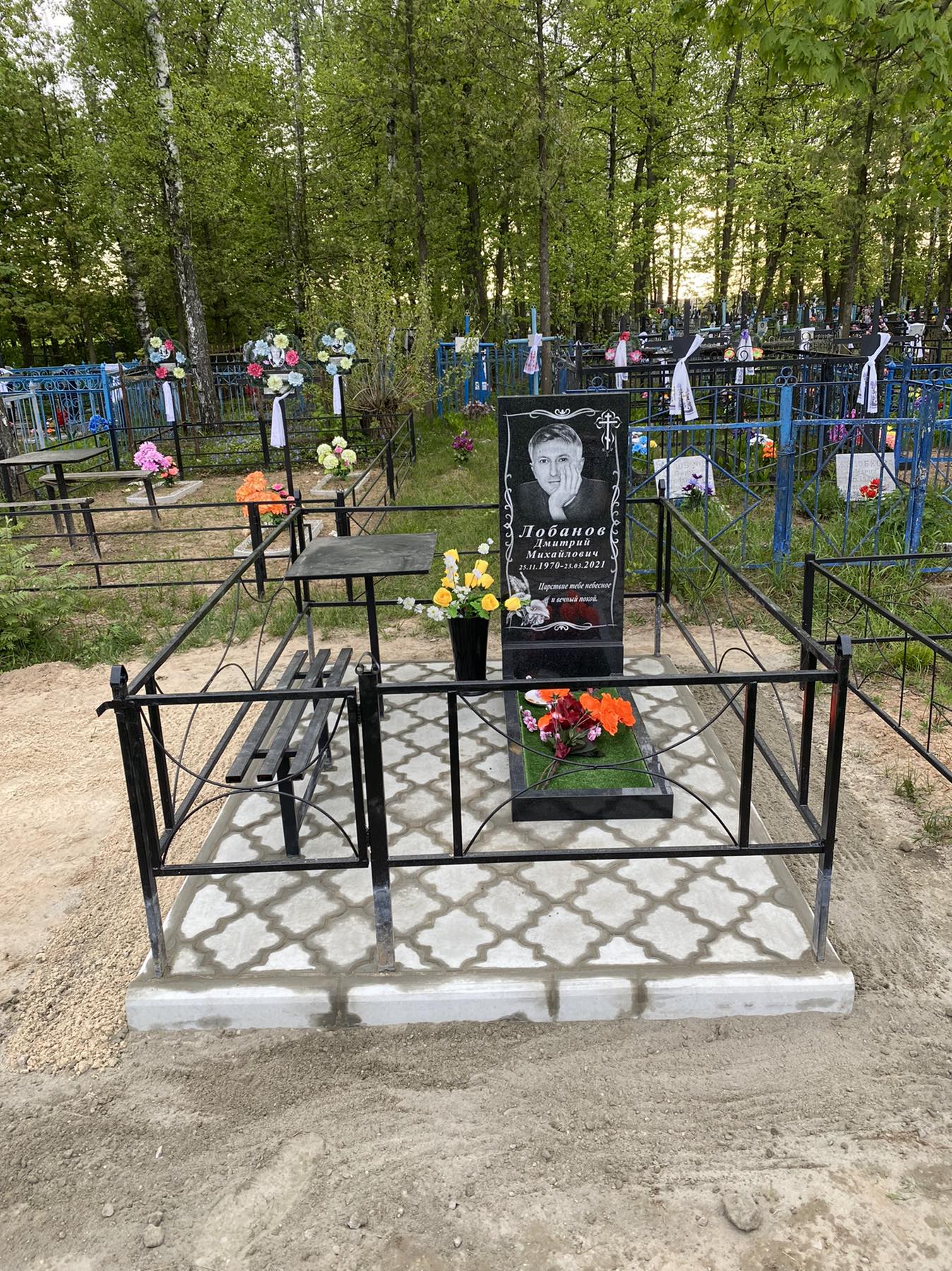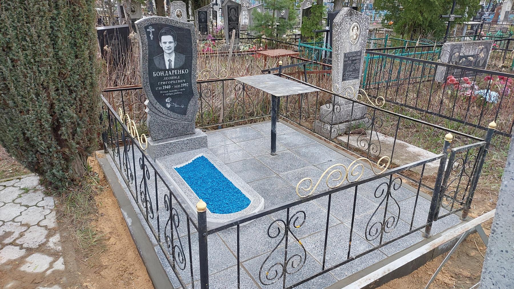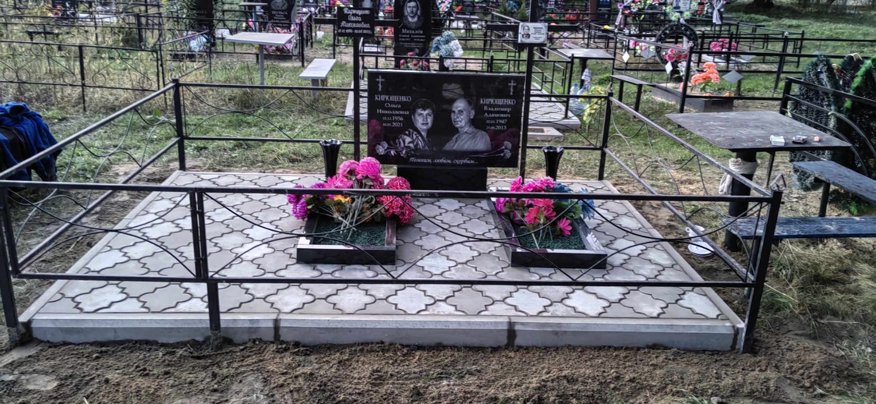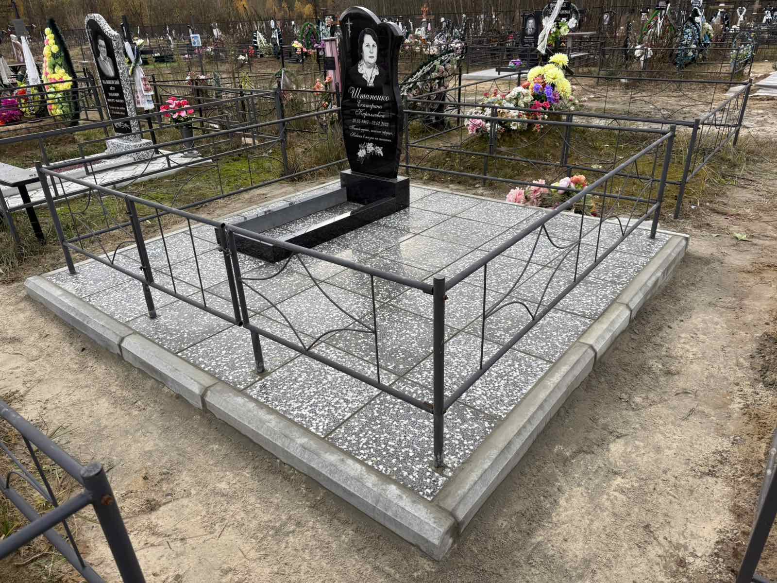 Что может входить в комплекс? Например, одна или несколько стел с ручной или пескоструйной гравировкой, разные модели цветника, бетонный цоколь с облицовочной плиткой, столик и скамья, вазы с цветами.