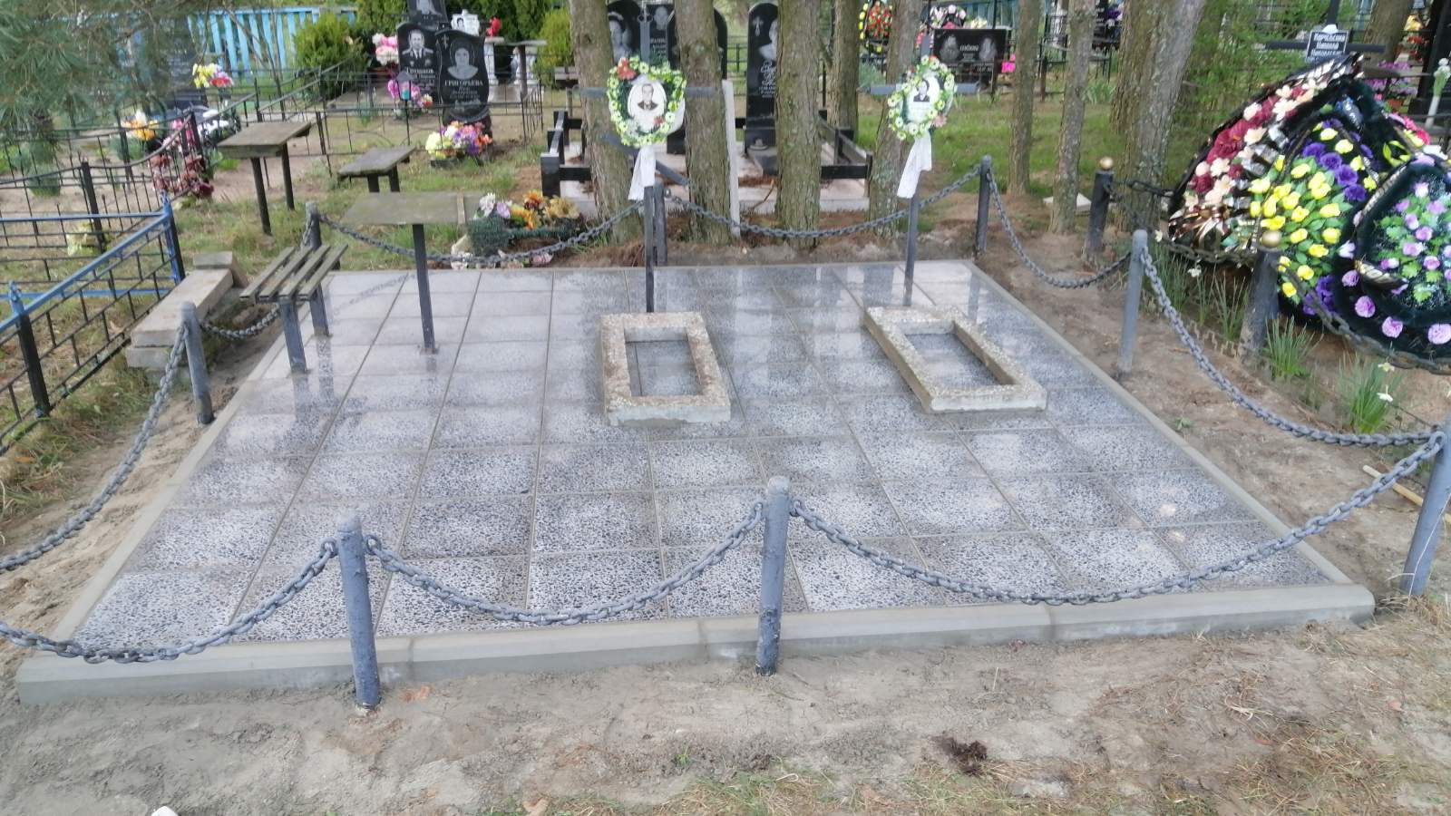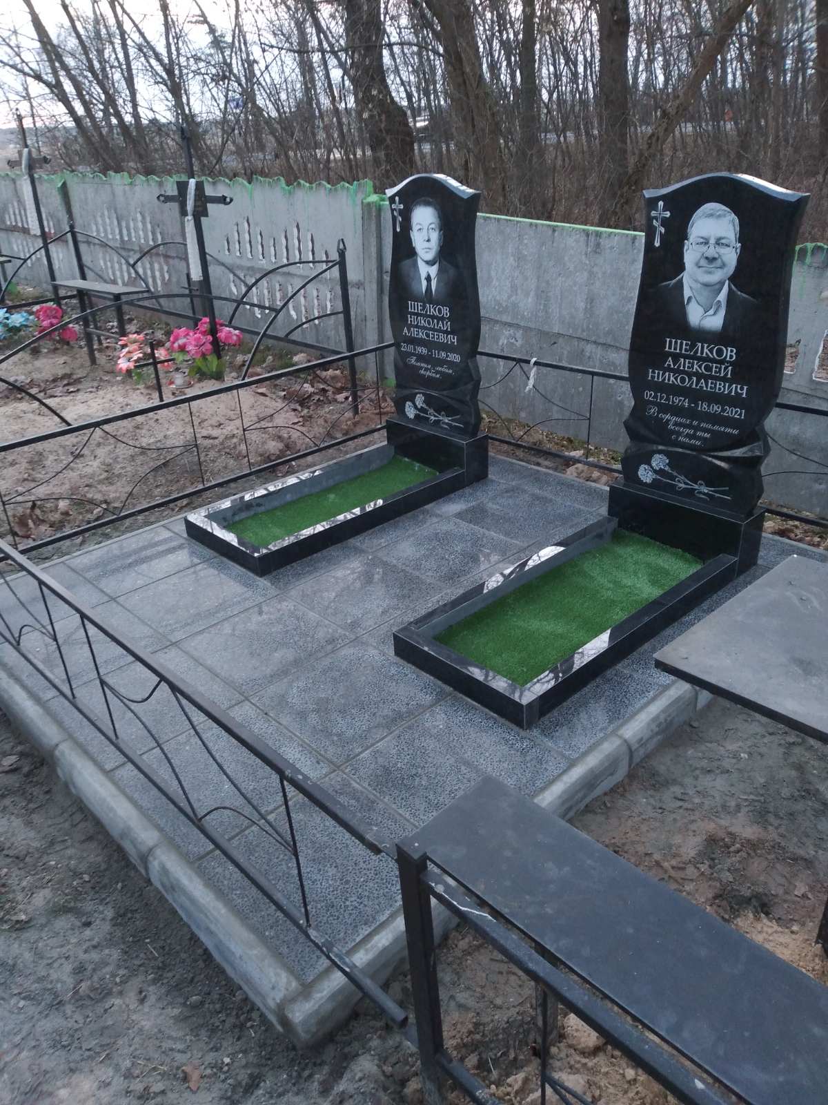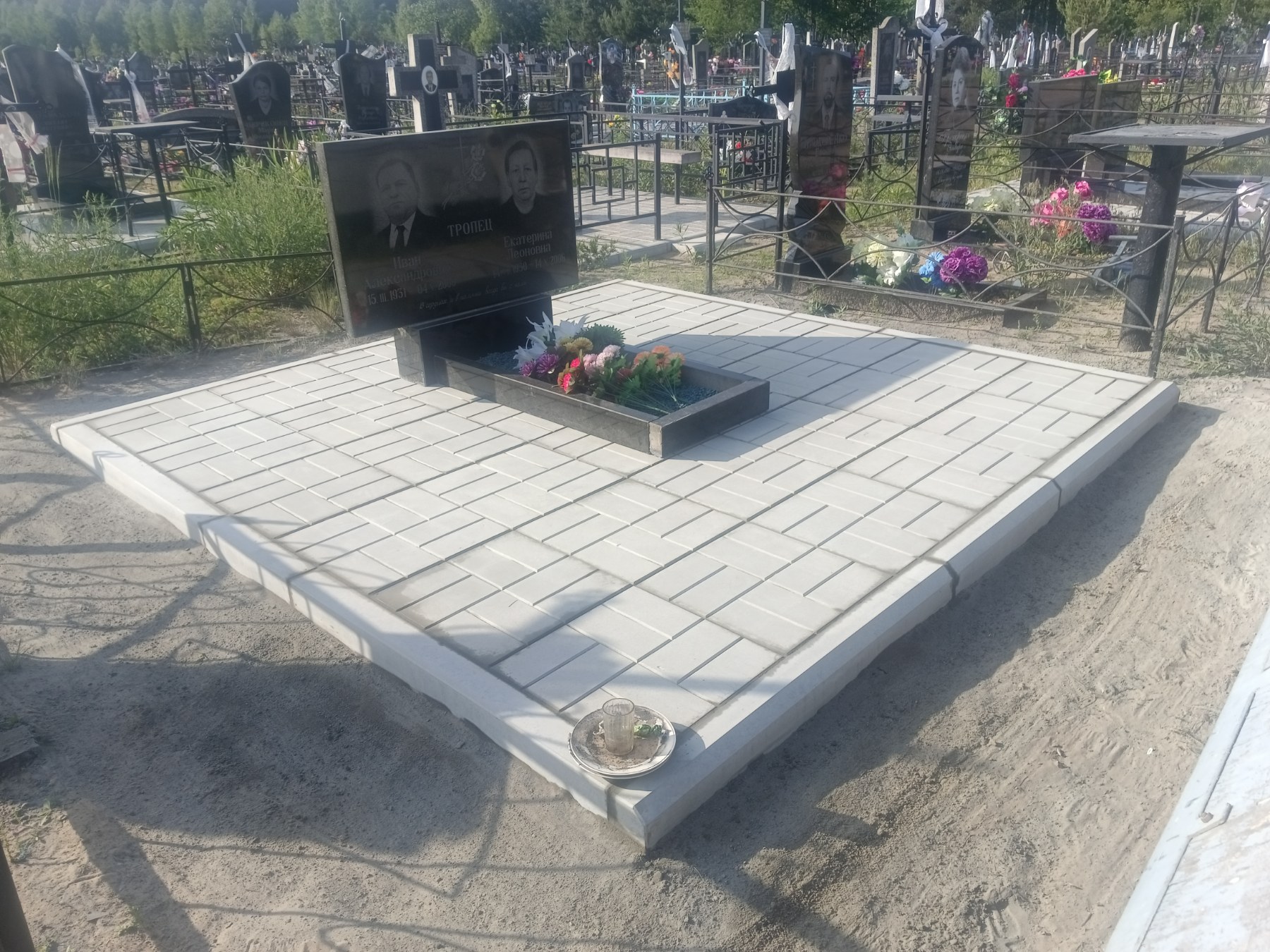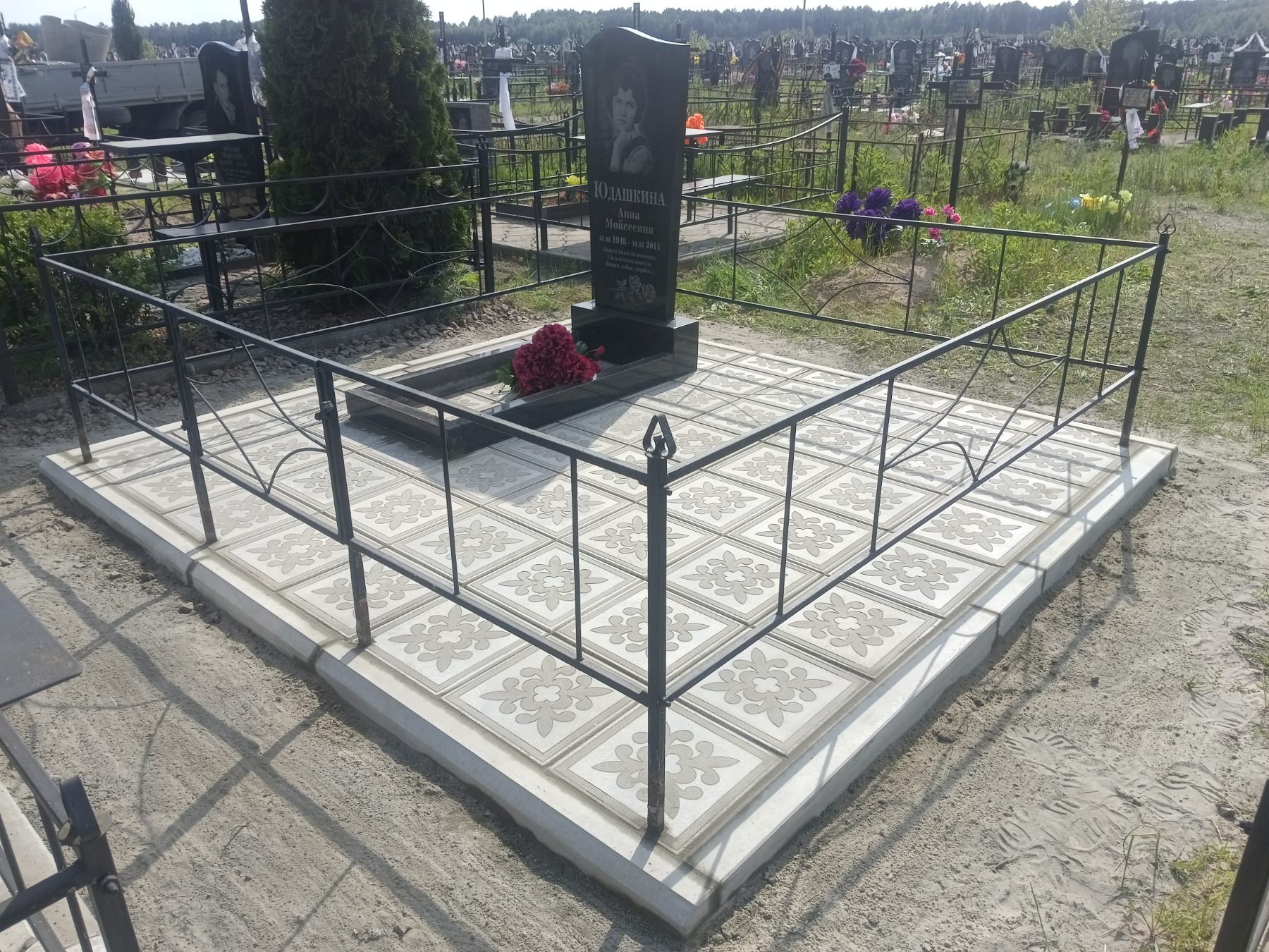 Что может входить в комплекс? Например, одна или несколько стел с ручной или пескоструйной гравировкой, разные модели цветника, бетонный цоколь с облицовочной плиткой, столик и скамья, вазы с цветами.