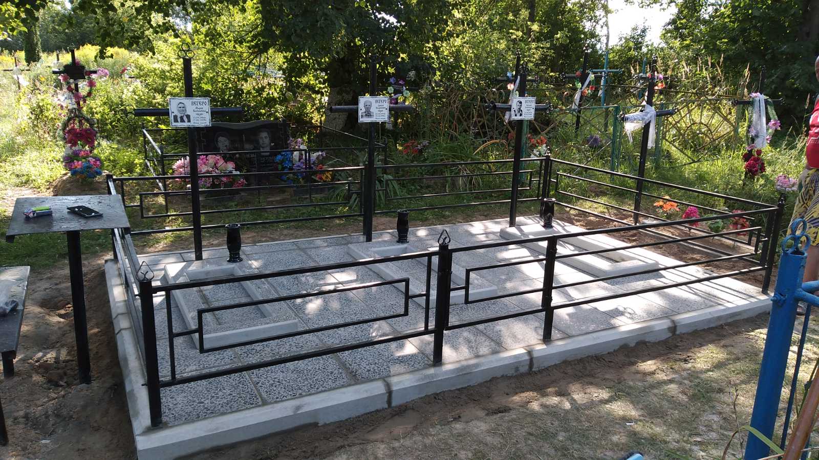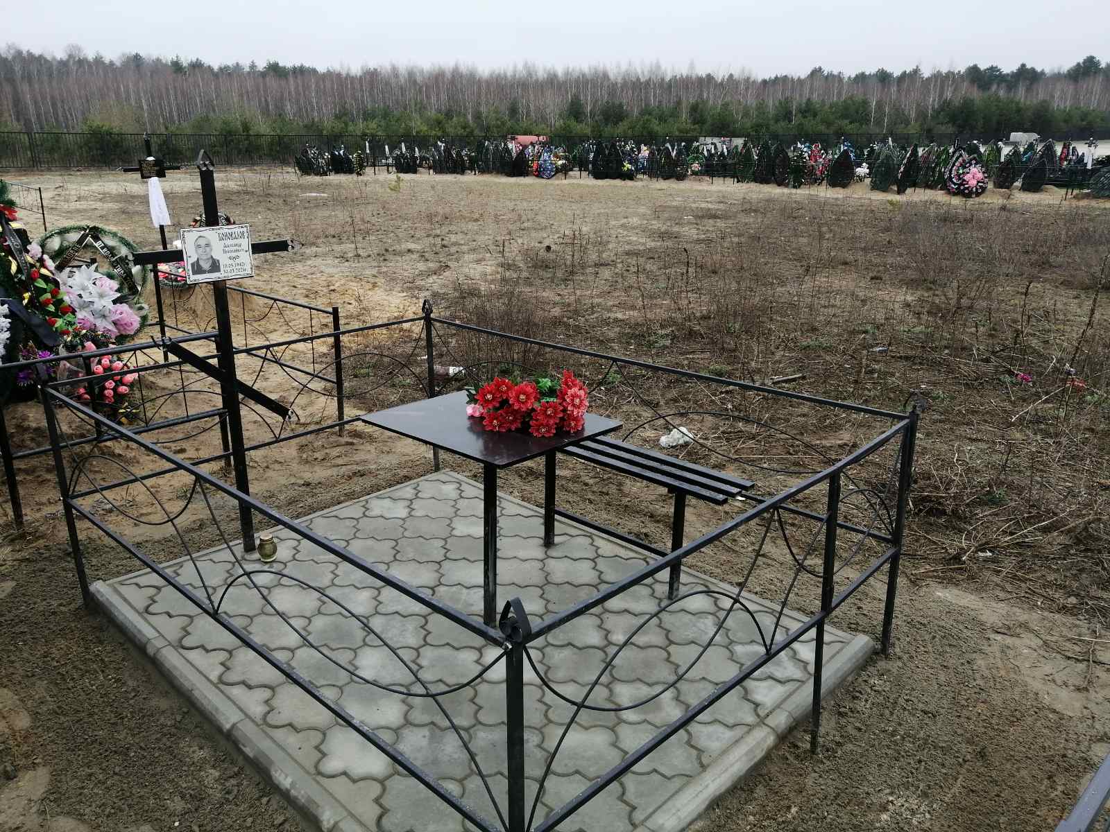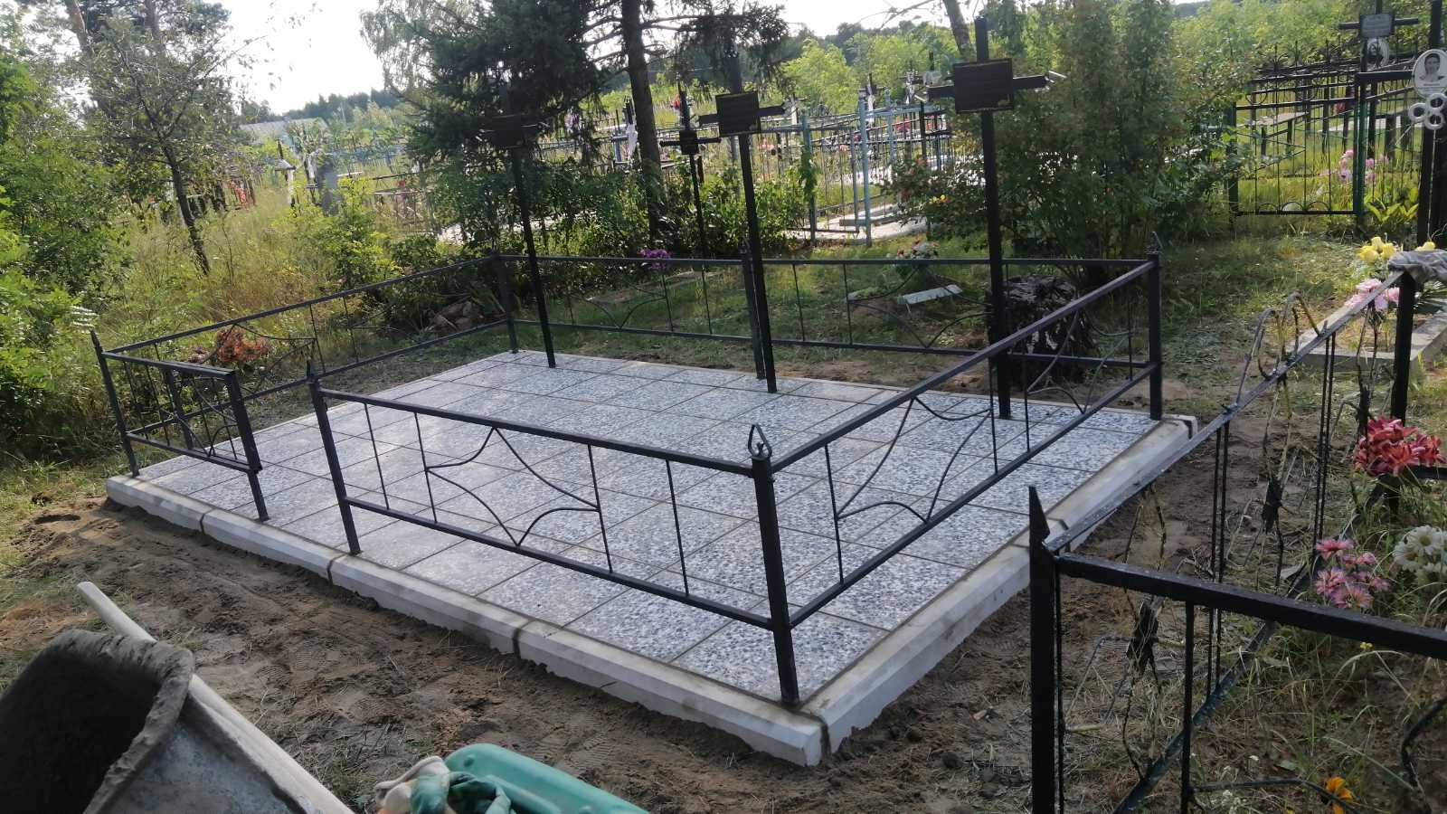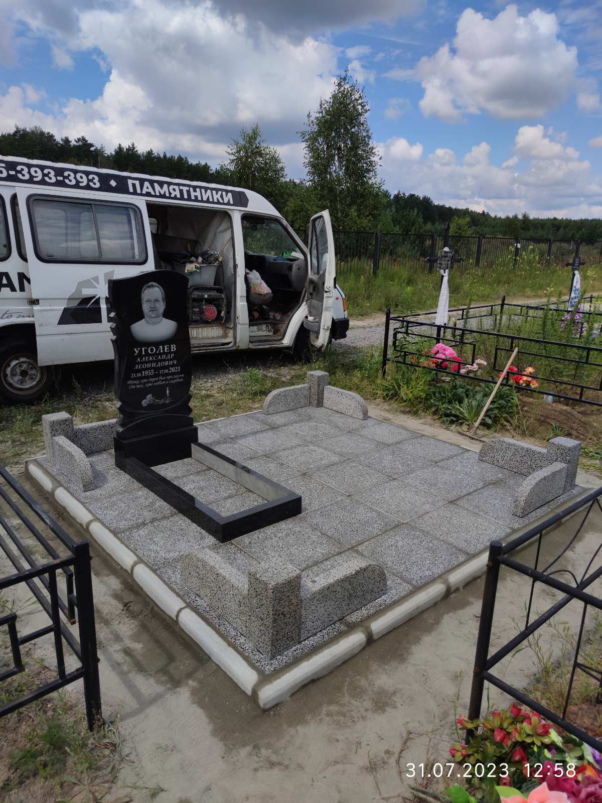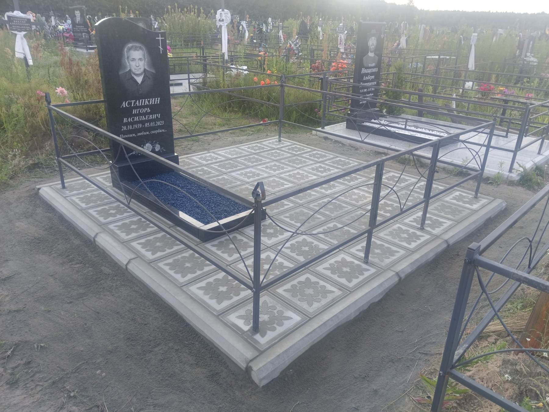 Что может входить в комплекс? Например, одна или несколько стел с ручной или пескоструйной гравировкой, разные модели цветника, бетонный цоколь с облицовочной плиткой, столик и скамья, вазы с цветами.