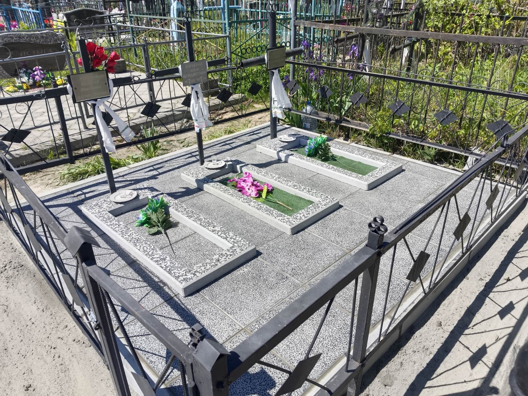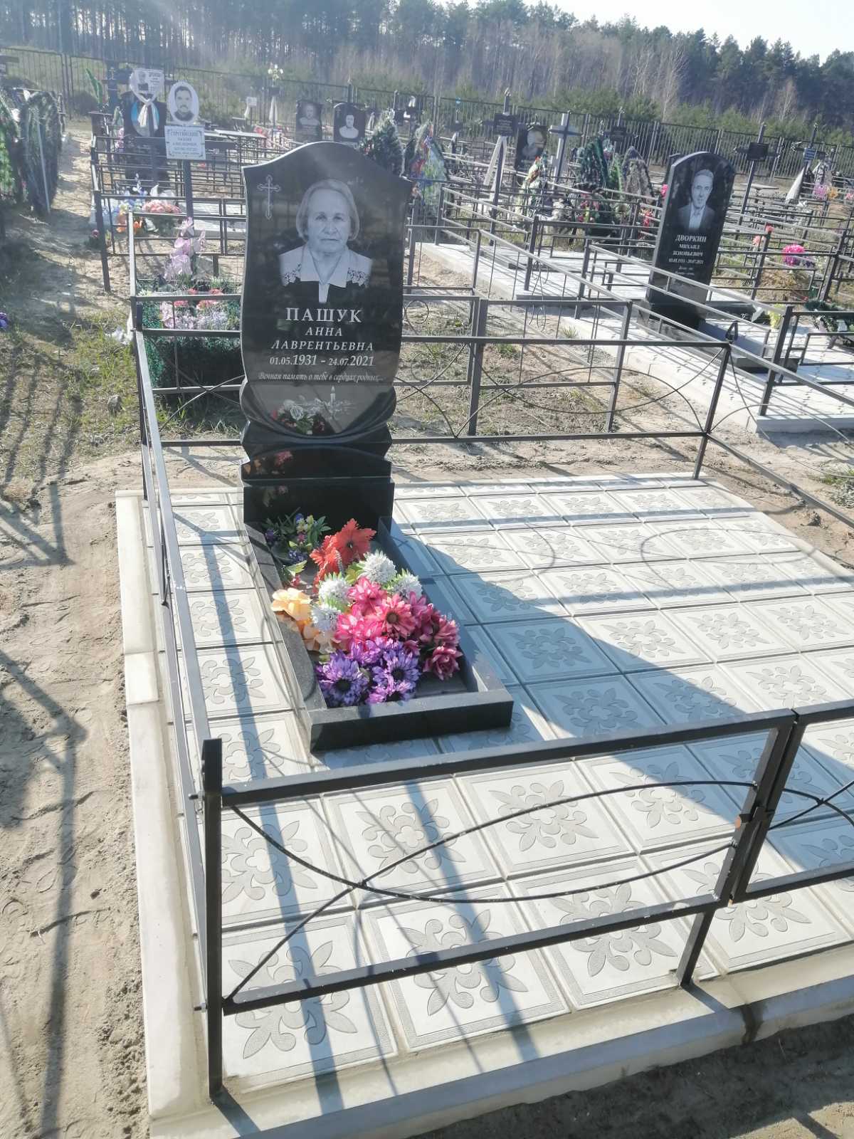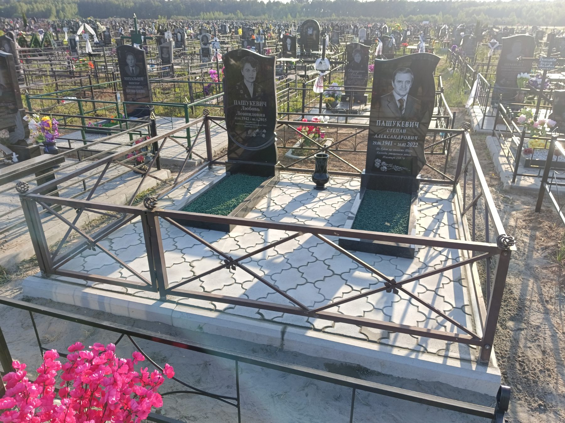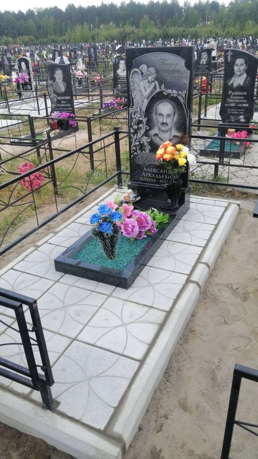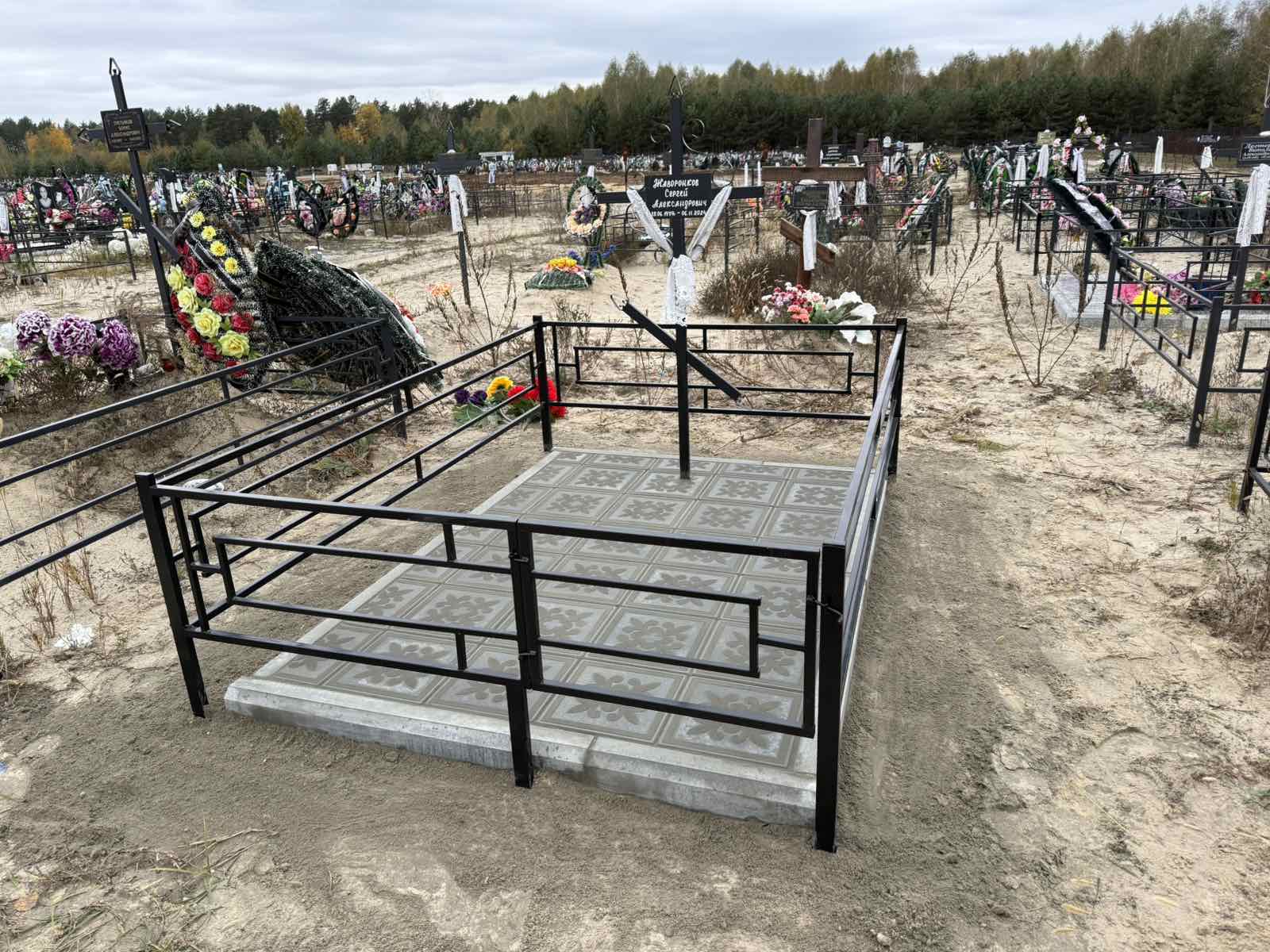 Что может входить в комплекс? Например, одна или несколько стел с ручной или пескоструйной гравировкой, разные модели цветника, бетонный цоколь с облицовочной плиткой, столик и скамья, вазы с цветами.
